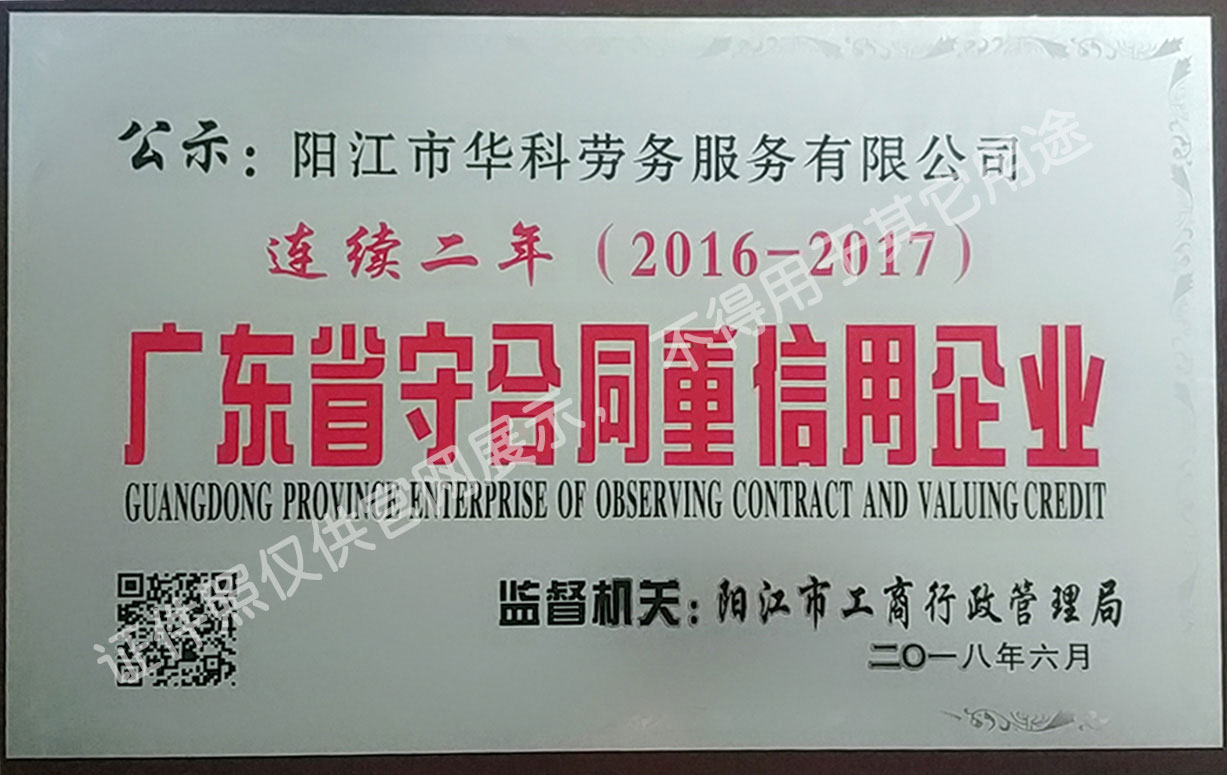 華科勞務服務有限公司是專業從事人事代理、勞務租賃、人力派遣及管理的綜合性服務機構,是首批獲得廣東省人力資源廳、陽江市勞動和社會保障局頒發人力資源許可證的合法單位。公司秉承“誠信務實、專業熱情、滿意第一、服務社群”的經營理念,在勞務派遣業務的基礎上,更致力于合同制工人(臨時工、實習生、假期工)方向發展,為用工企業及時輸送合格的各類人才,合理調配人力資源的有序流動,幫助求職者尋求更加滿意的就業渠道和崗位,切實維護求職者的合法權益。
